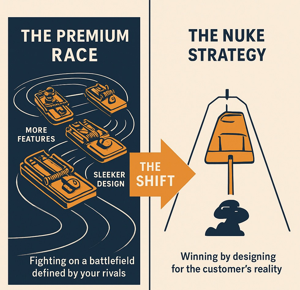 The Nuke Strategy begins with a fundamental rejection of business as usual. For generations, we’ve been taught to win by building a better mousetrap; out engineering, out featuring and out marketing the competition in a relentless Premium Race. This path is not just crowded and expensive; it is a strategic trap. You are fighting on a battlefield defined by your strongest rivals, for customers they have already identified, using rules they have already mastered.