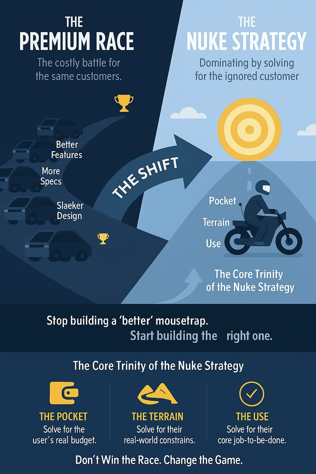 The Nuke Strategy proposes a different path: stop building a better mousetrap, and start building the right one. The right mousetrap isn’t defined by your competitors’ specs, but by the customer’s unserved reality. It is the product perfectly calibrated to their Pocket (real economic constraints), their Terrain (actual environment and infrastructure) and their Use (core job to be done). This is why ignored markets are the world’s greatest opportunities. They are not barren wastelands; they are green fields where the premium products are hopelessly mismatched and where a context perfect solution can achieve uncontested dominance. The goal is not to win the game everyone is playing, but to change the game entirely.